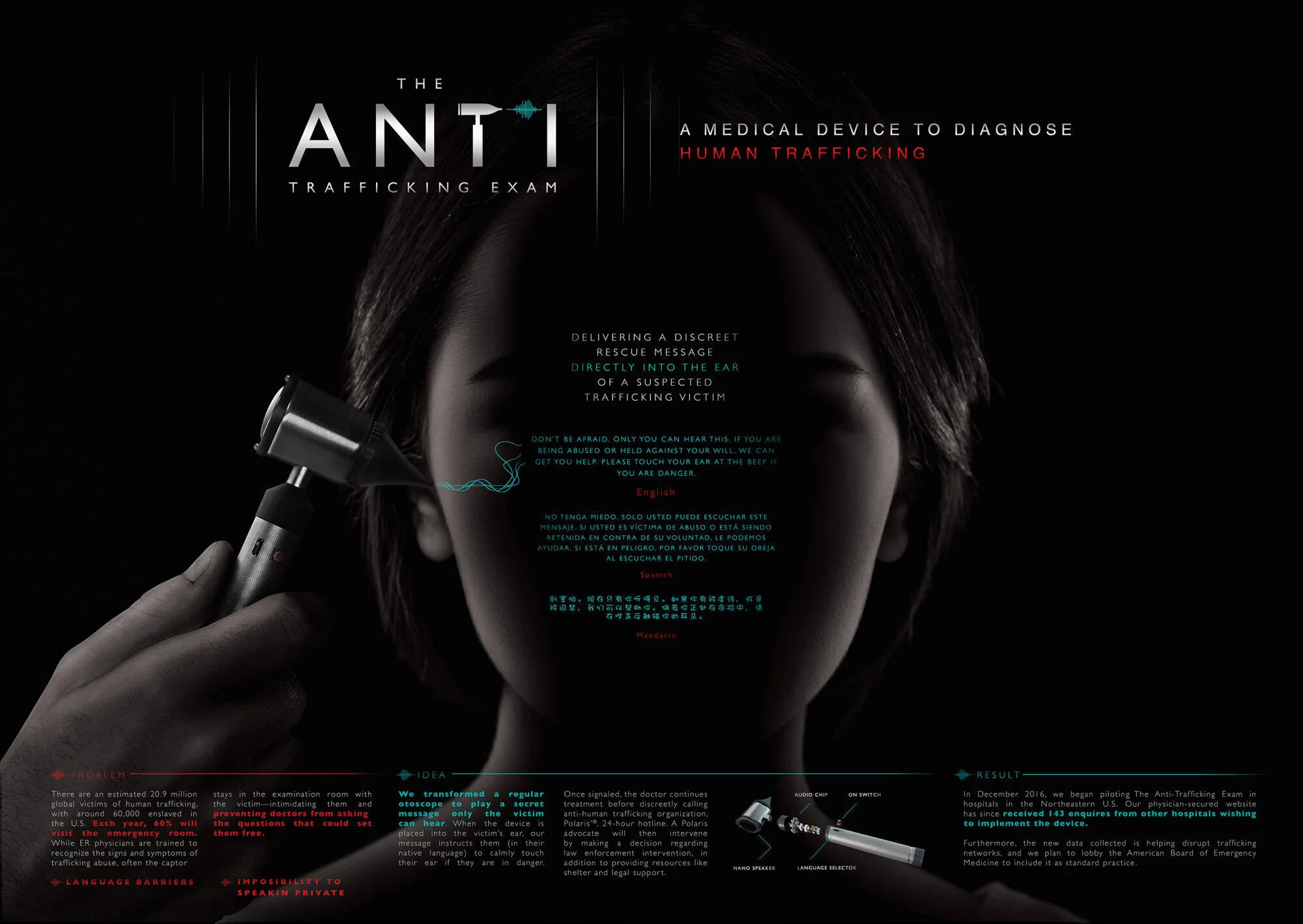 After learning that 60% of human trafficking victims visit the emergency room, often with their captors, we developed the Anti-trafficking Exam to seize this moment to intervene. By modifying a standard otoscope, we delivered a covert message to victims offering them help without alerting their traffickers.