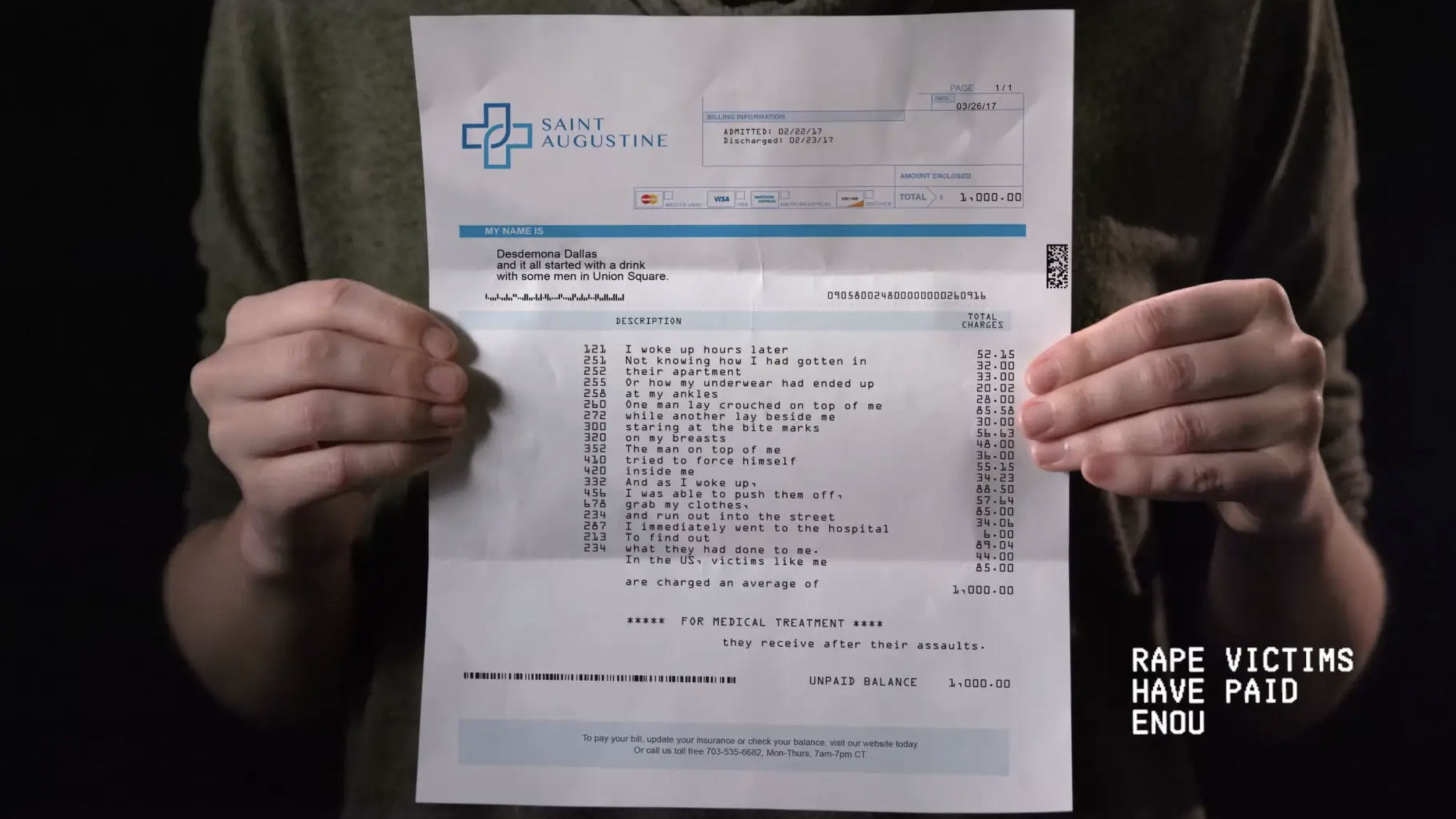 This campaign exposes a hidden injustice: survivors of sexual assault are often burdened with medical bills for the treatment they urgently need. By transforming real-life stories of rape into stark hospital bills, this campaign powerfully revealed the harsh reality that survivors face—not only fighting trauma but also financial hardship.
